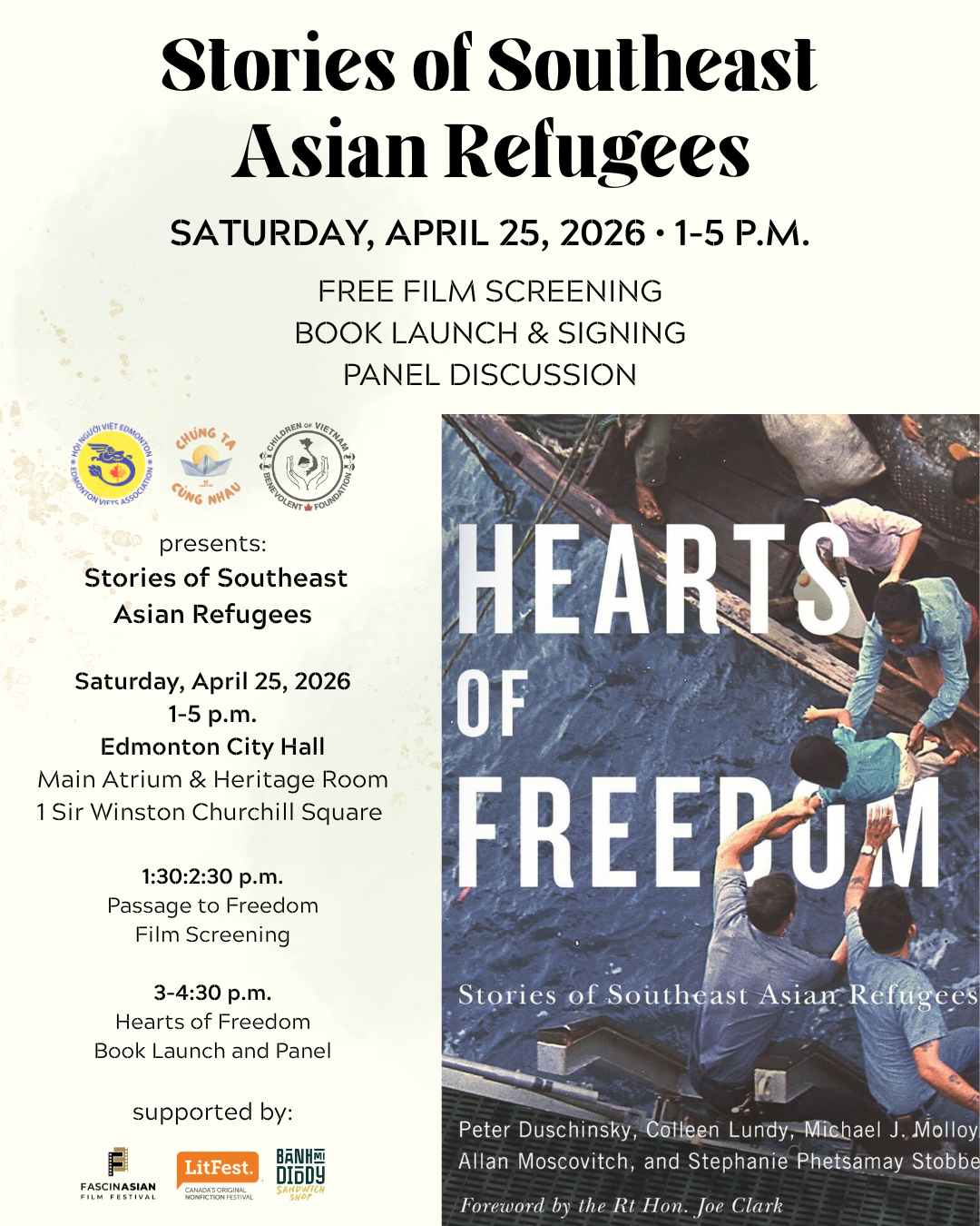 Stories of Southeast Asian Refugees takes place ahead of the anniversary of the Fall of Saigon, which led to the mass evacuation of Vietnamese refugees ("boat people") in the late 1970s and early 1980s. Many resettled as immigrants in Canada, the U.S. and Australia. As the book Hearts of Freedom emphasizes, this event comes at a particularly poignant time amidst renewed tensions over immigration and refugee policies and programs in North America. Join us in understanding and celebration of immigrant history and contributions in Canada.